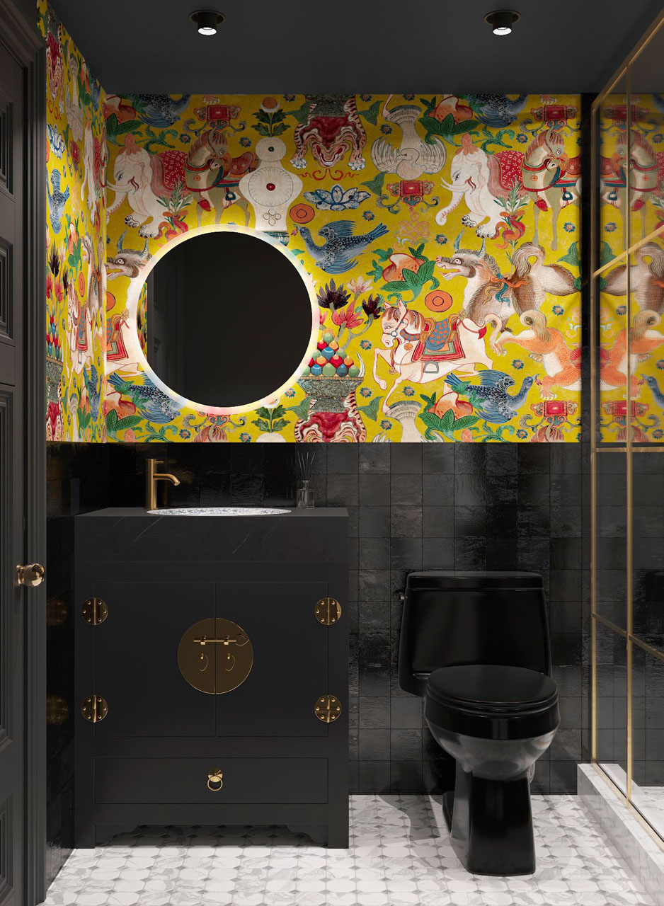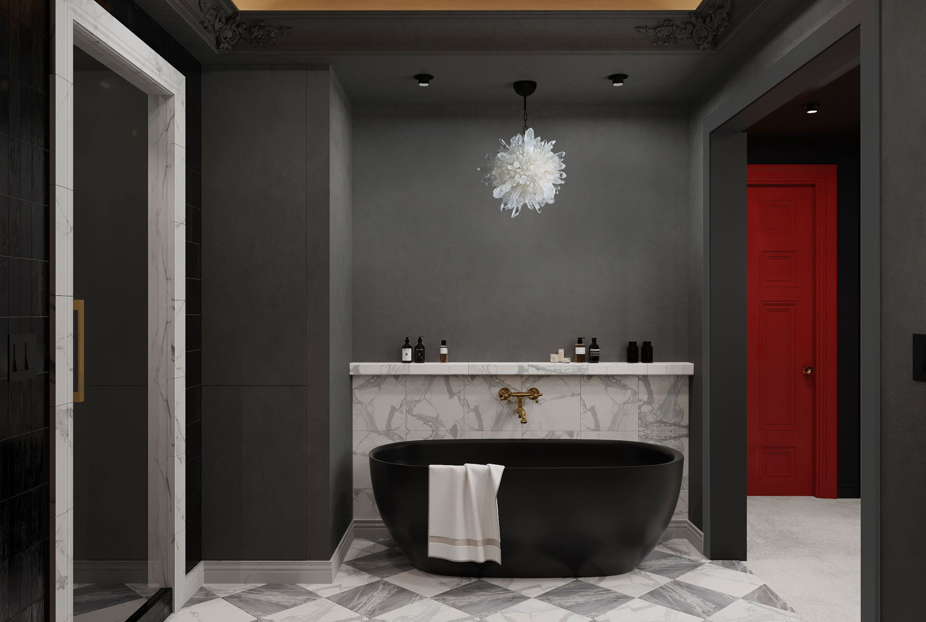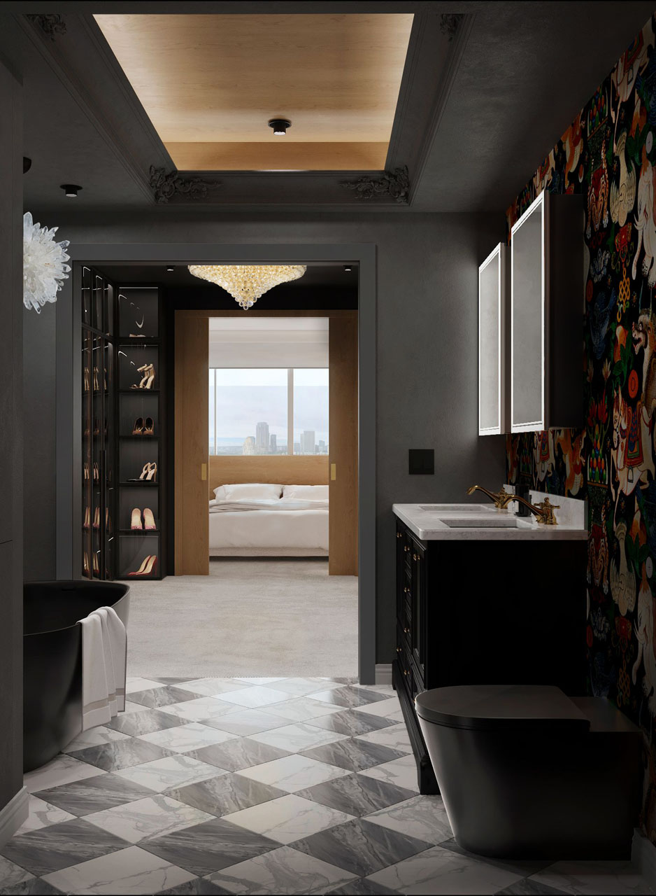 Prepare to be enchanted by the sheer chicness and opulence of this space. Luxurious finishes and bold design choices come together to create an ambiance that is both elegant and unforgettable. The deep, accent dark walls add a touch of drama to the space, making it feel intimate and cozy, yet glamorous at the same time.